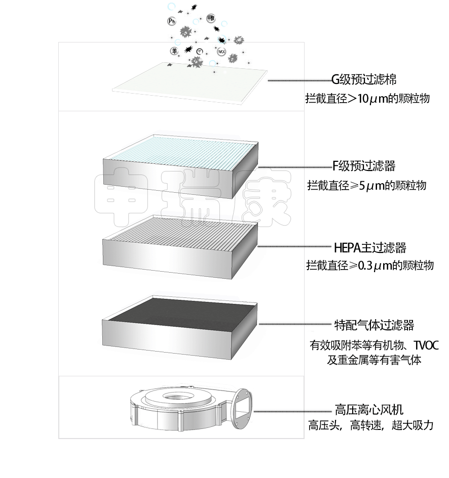 3.氣體過濾層選用浸漬型活性炭加分子篩及氧化劑做吸附劑,能對煙