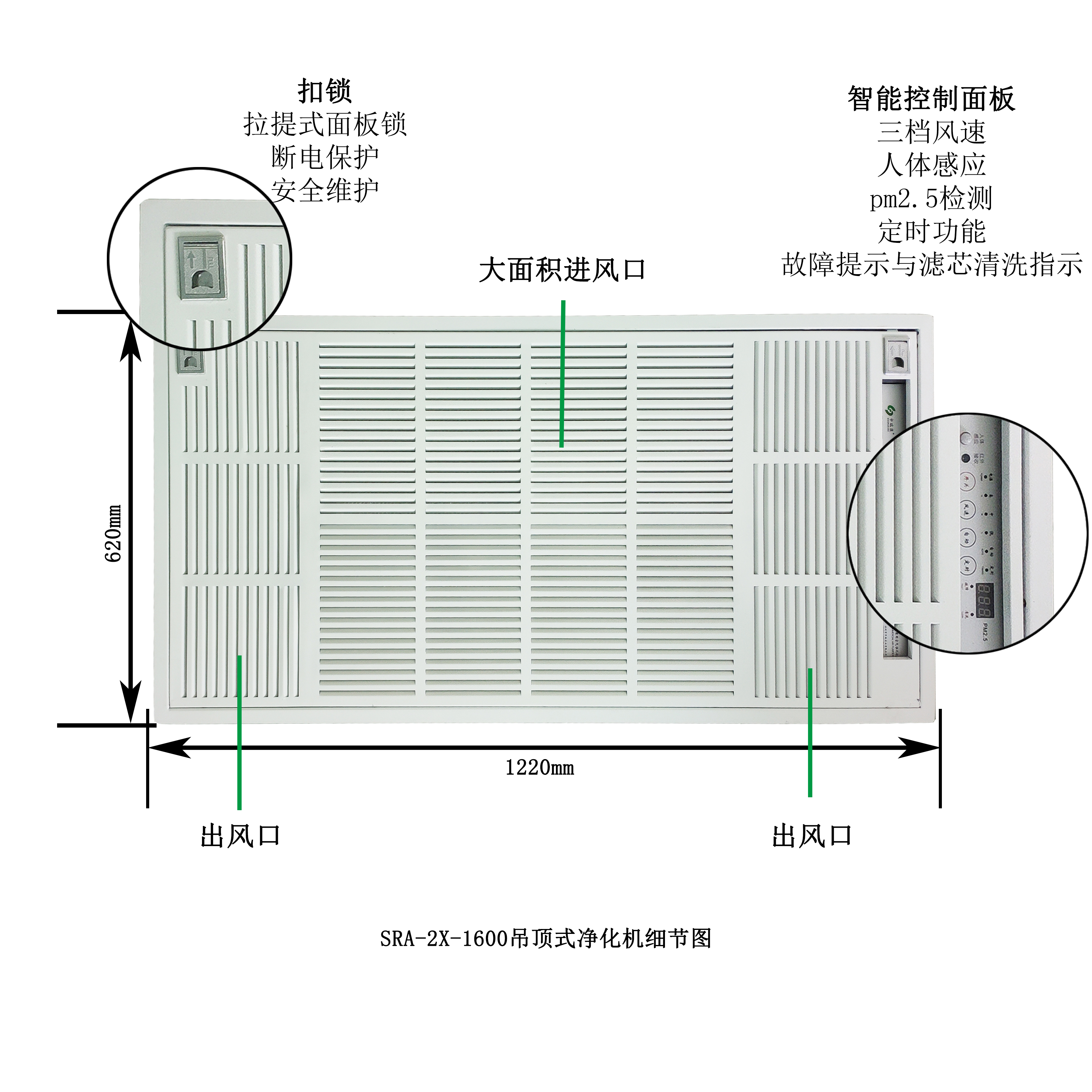 SRA吊頂式空氣凈化機,獨立凈化,無需外排,不用鋪設(shè)管道。通過凈化機內(nèi)置電機,氣流從進風(fēng)口吸入,進行凈化處理后,潔凈空氣直接循環(huán)在室內(nèi),持續(xù)凈化。 該凈化機可完全消除空氣中直徑大小為0.01μm的香煙煙霧、細(xì)菌、飄塵等有害物,有效去除空氣中的臭味、異味等,空氣濾凈效果達99%以上。