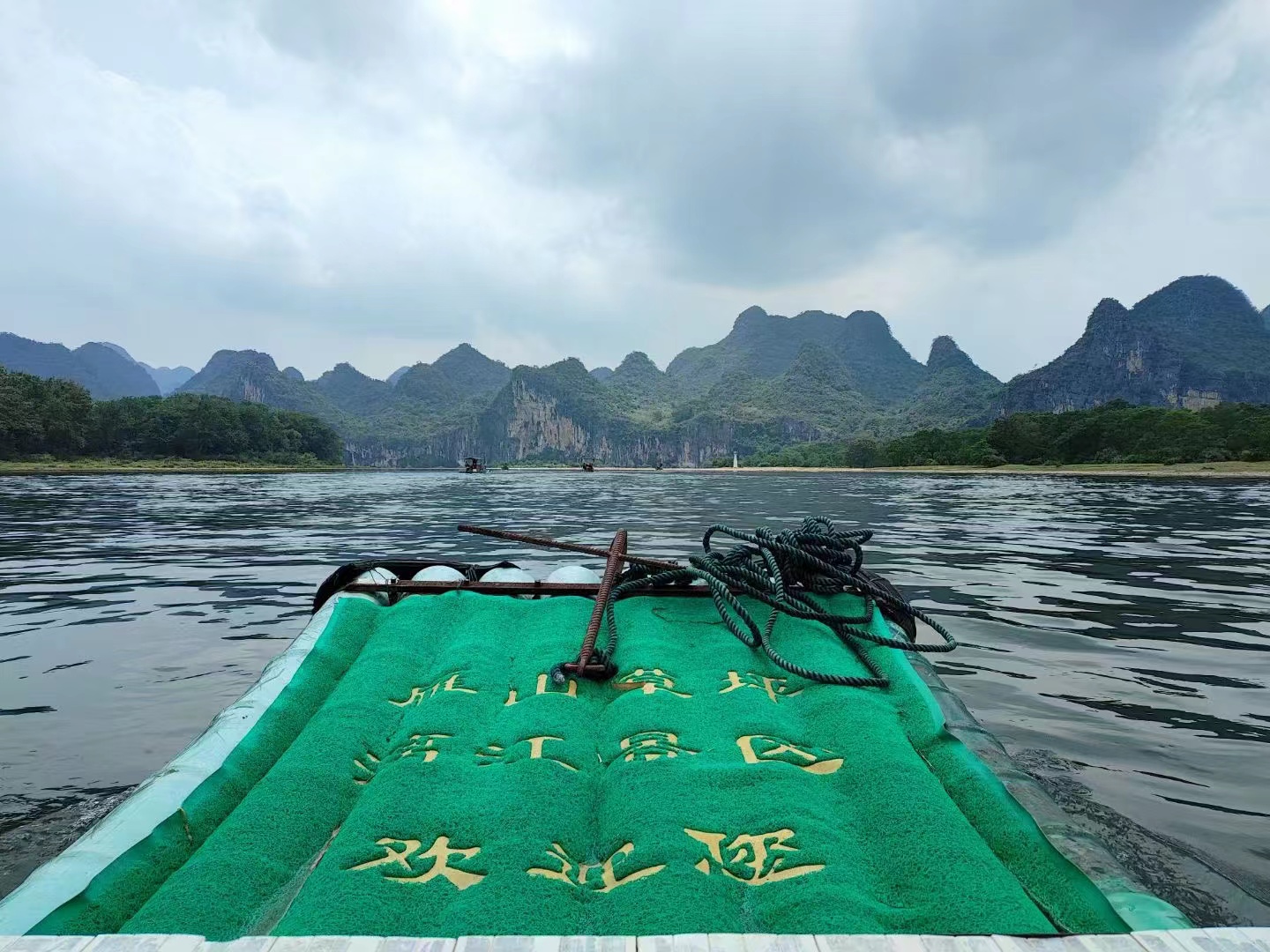 下午我們乘坐小竹筏,游覽漓江。兩岸山峰清秀迤邐,連綿起伏,形態(tài)萬千,江岸綠草如茵,翠竹蔥郁,樹木繁蔭。讓人仿佛進入了天人合一的詩意境界,返璞歸真的自由天地。